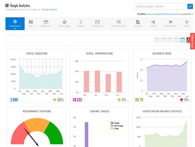 Track critical Google Analytics data in real time right from the dashboard. No need to log-in to Google separately to view traffic data. We’ve cut the crap and added sections that actually matter to your business.